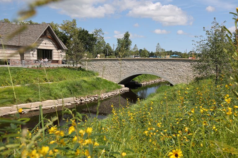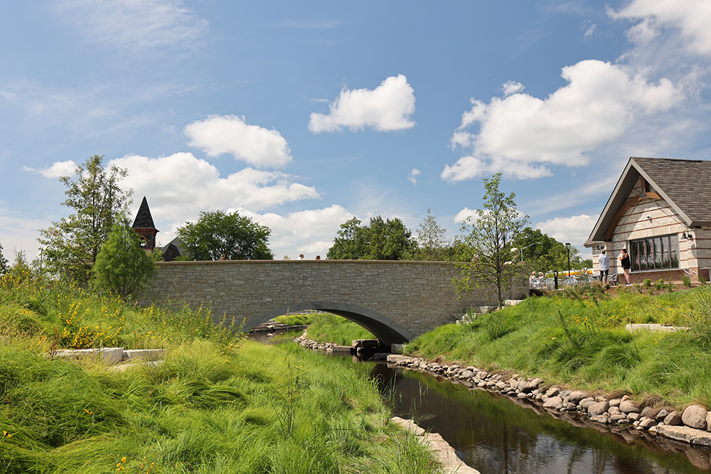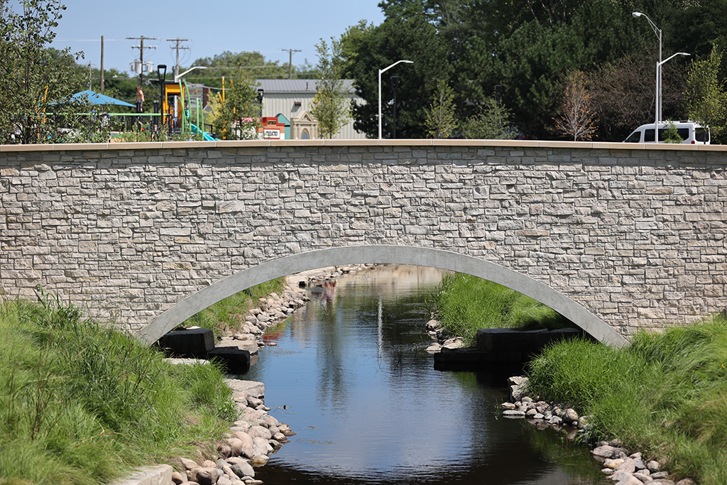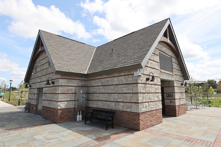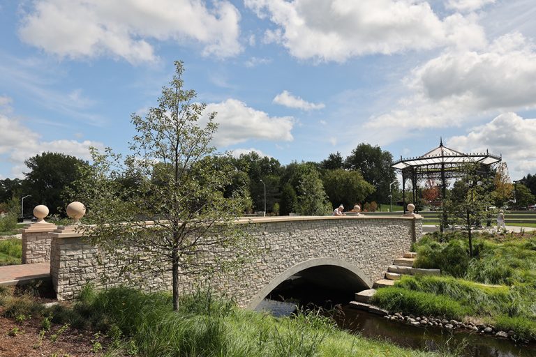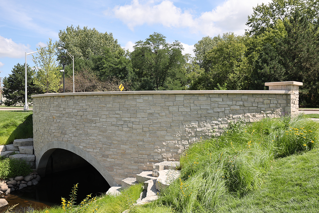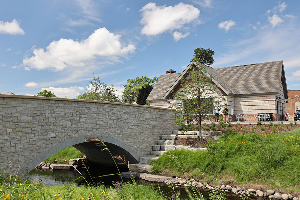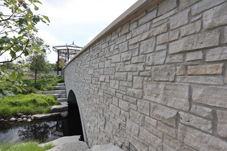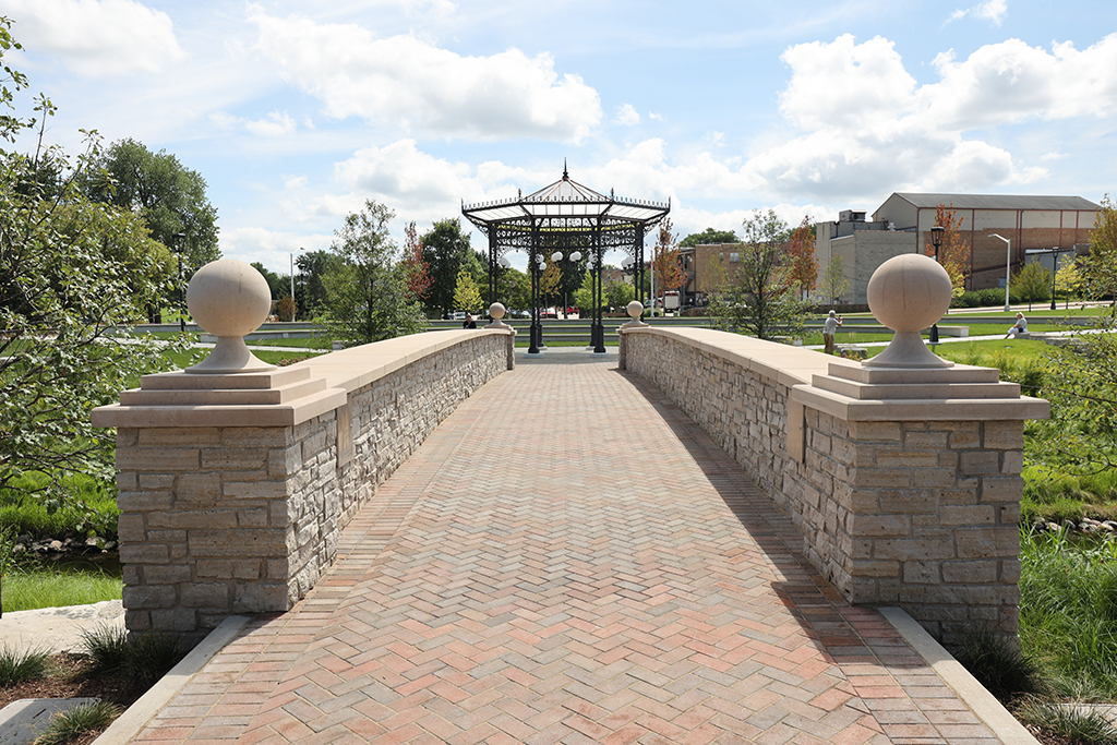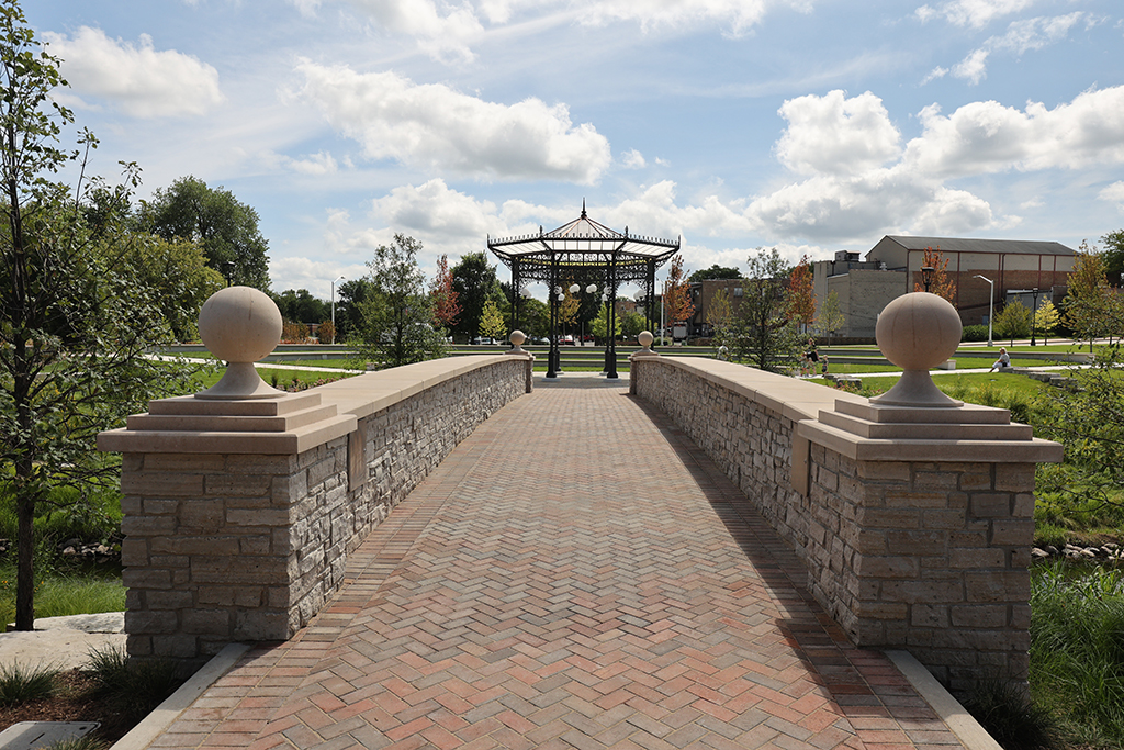 This newly developed park in downtown Antioch features Fond Du Lac Heritage Blend stone veneer seat walls topped with limestone and precast caps. The café and concession building incorporates a harmonious blend of Belcrest 760 Sand brick and stone veneer. Additionally, stone veneer accents the bridges that span the creek. Project Foreman: Jason Buchert.