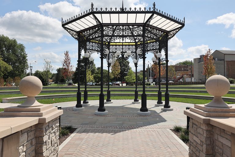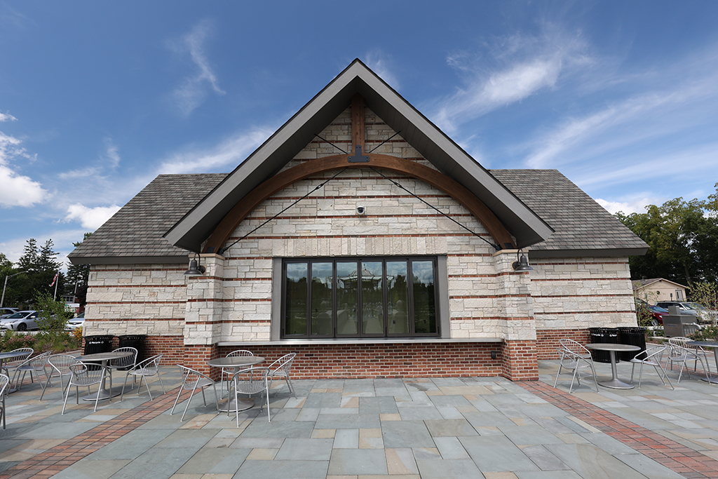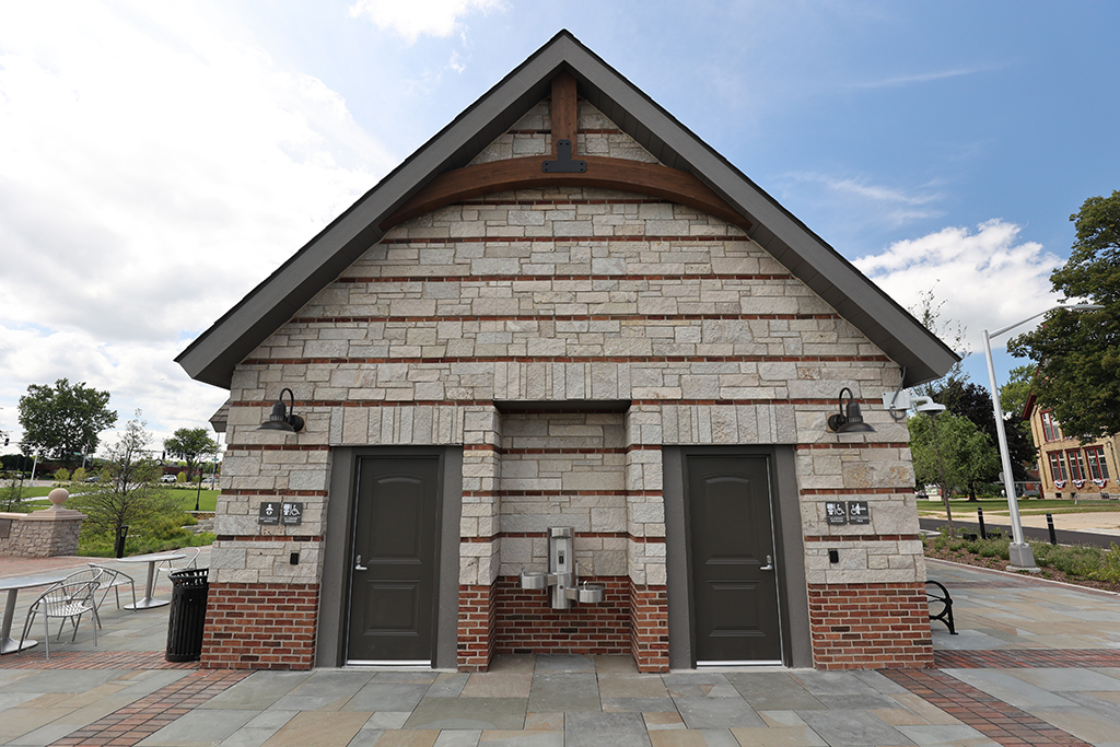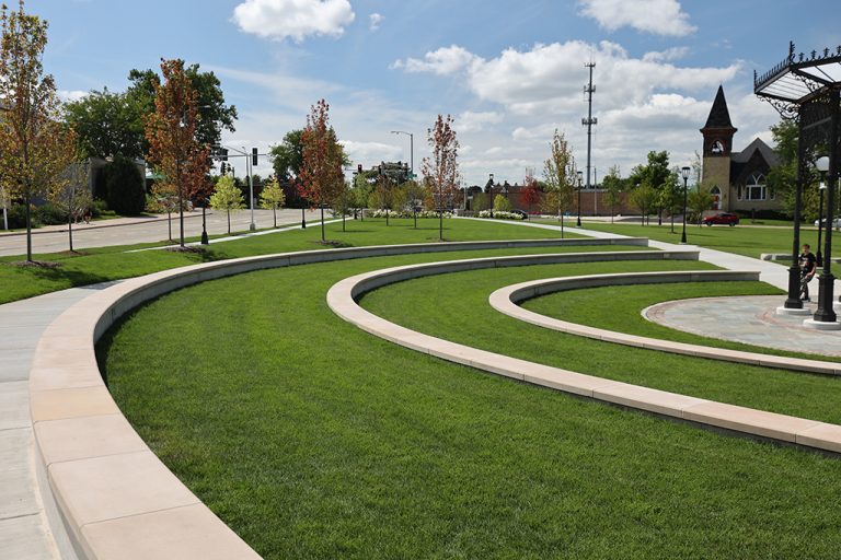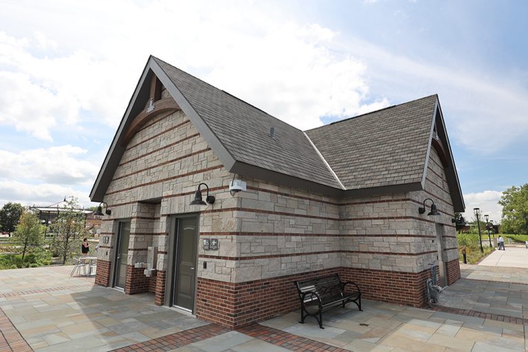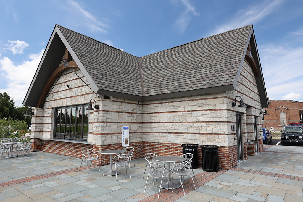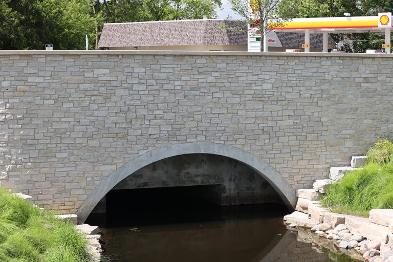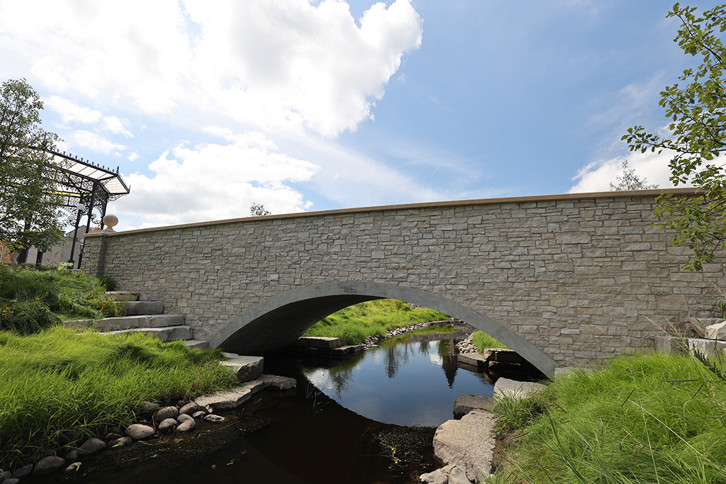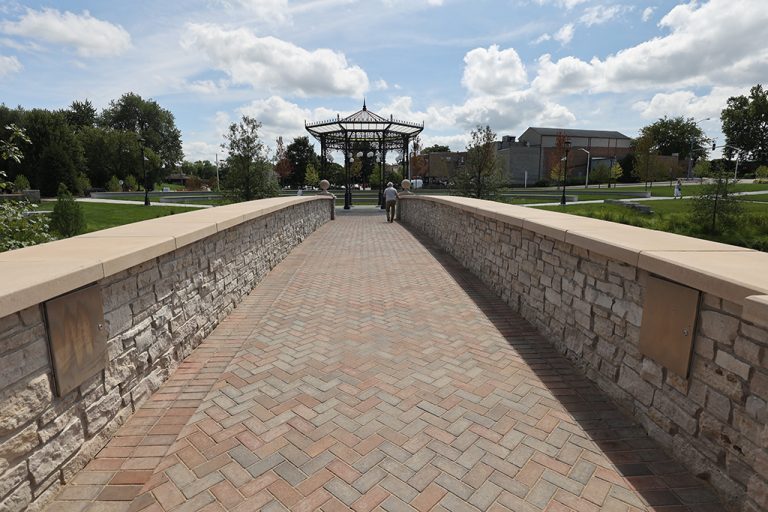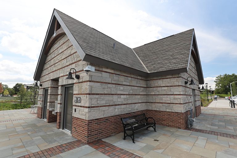 This newly developed park in downtown Antioch features Fond Du Lac Heritage Blend stone veneer seat walls topped with limestone and precast caps. The café and concession building incorporates a harmonious blend of Belcrest 760 Sand brick and stone veneer. Additionally, stone veneer accents the bridges that span the creek. Project Foreman: Jason Buchert.