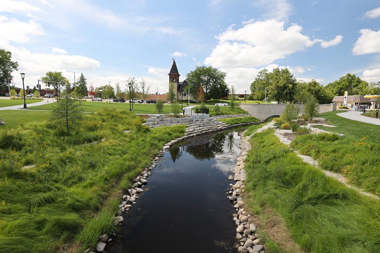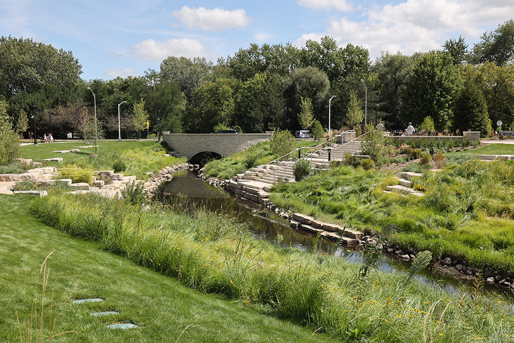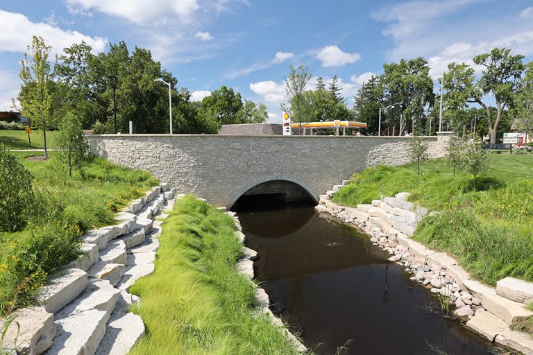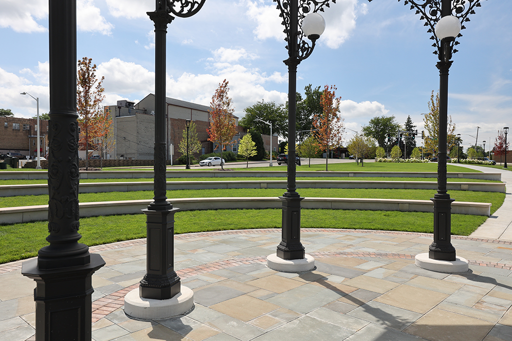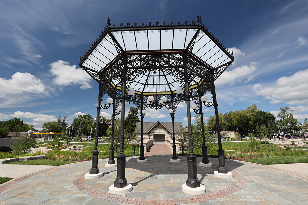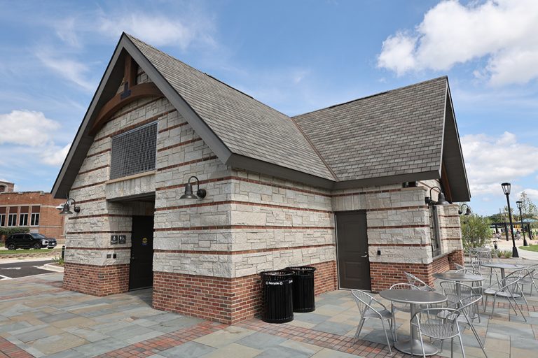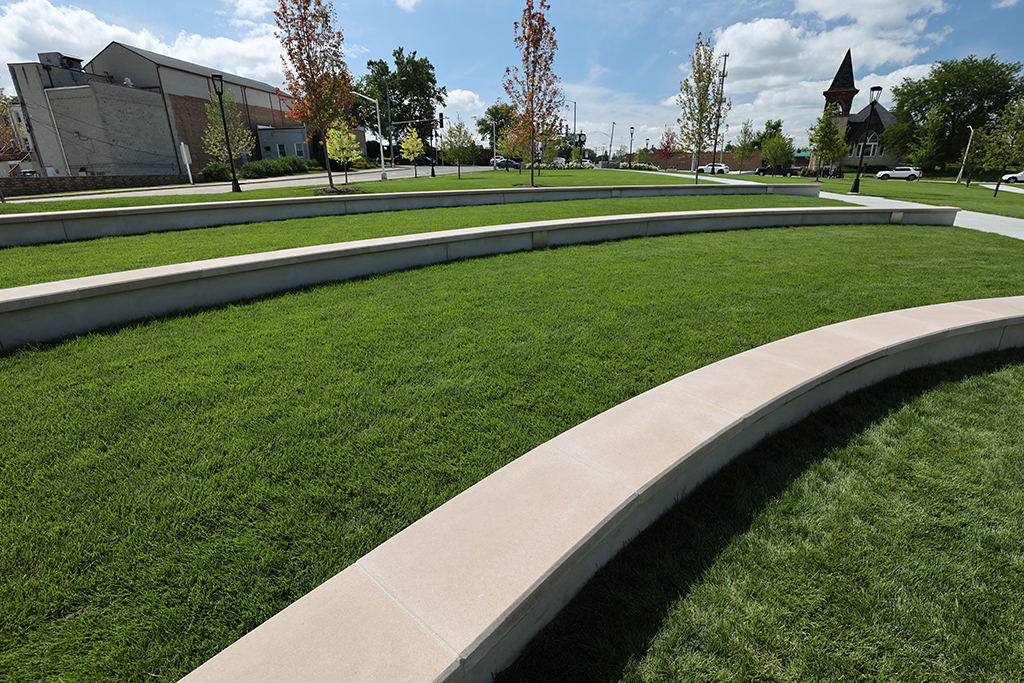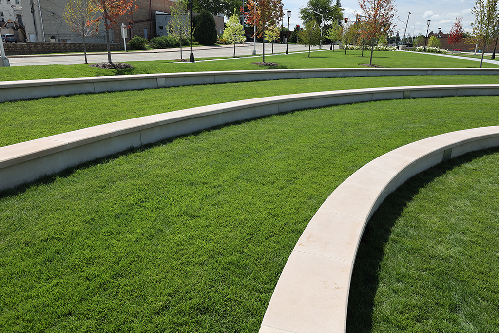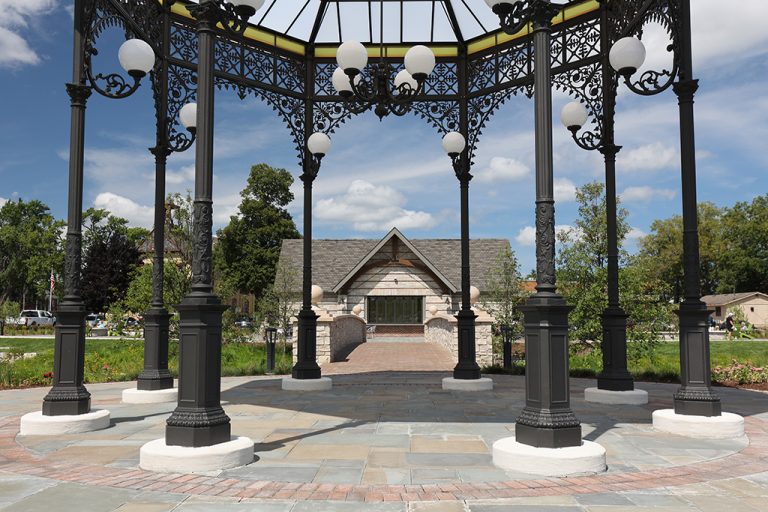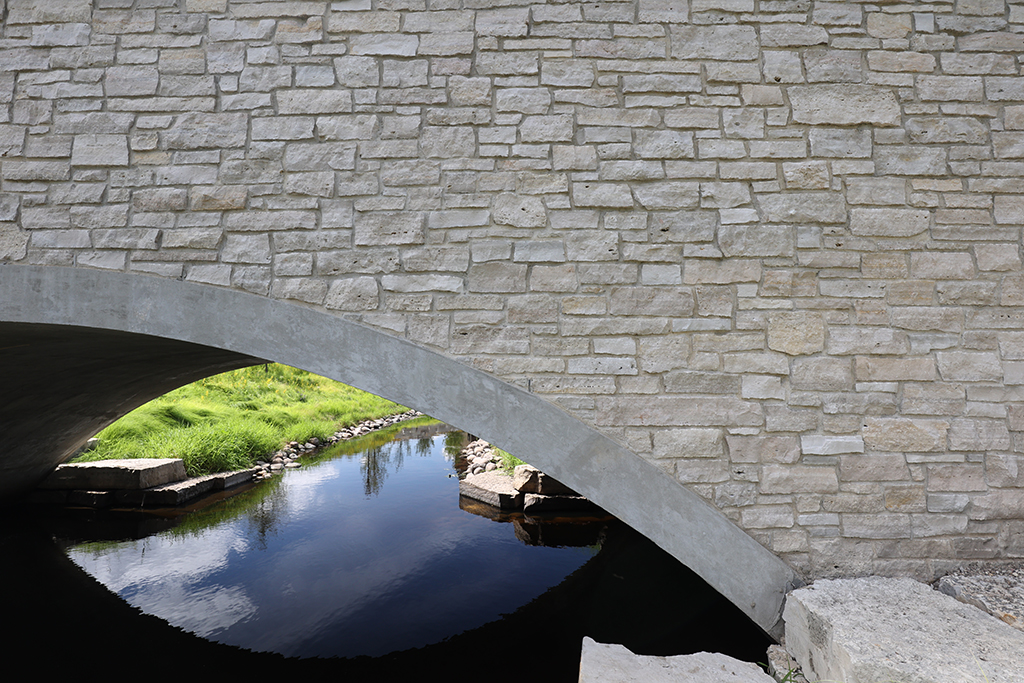 This newly developed park in downtown Antioch features Fond Du Lac Heritage Blend stone veneer seat walls topped with limestone and precast caps. The café and concession building incorporates a harmonious blend of Belcrest 760 Sand brick and stone veneer. Additionally, stone veneer accents the bridges that span the creek. Project Foreman: Jason Buchert.