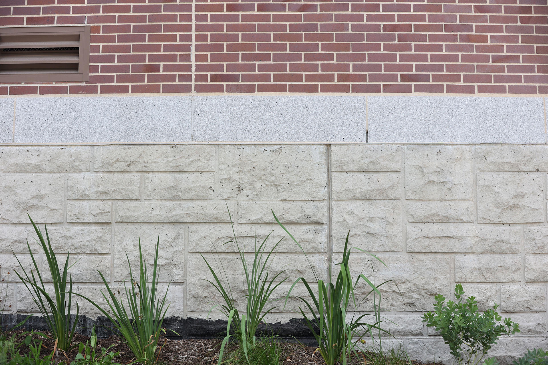 This project is an example of the use of architectural precast, natural stone, and face brick to create an striking contrast. The bottom of the piers and the wing walls are constructed of a blend of Brookfield Grey and Chilton Ledge Stone from Halquist Stone. The precast bands, copings, and caps are supplied from Architectural Cast Stone. The brick shown is a Roman Red made by Meridian Brick.